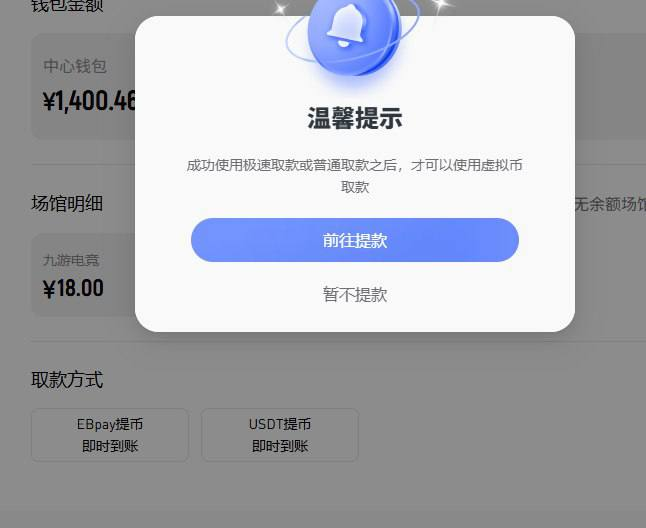 我从未用过人民币存提,并且之前用过U提款,我是EB存款的,但是要用到U提款时候,被限制,我真金白银从开云提到EB然后充值到九游,但是被这样限制,最后被搞心态,输没了。