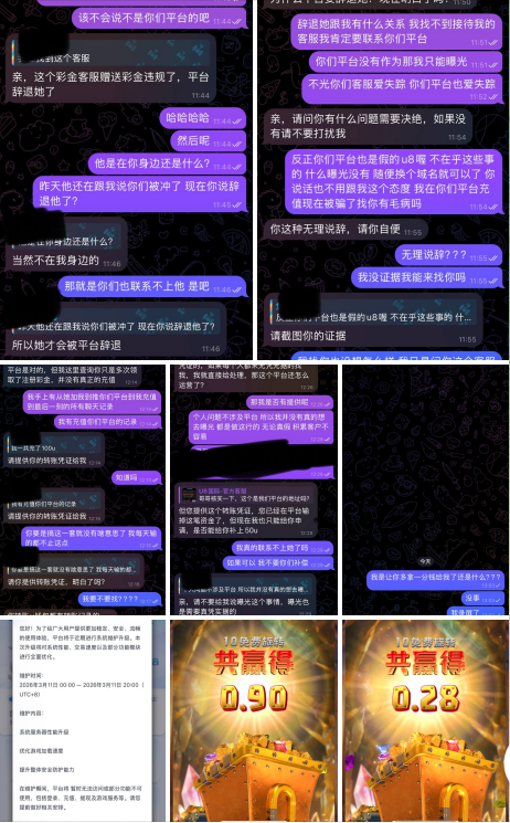 所有的一切都和真的u8一模一样怪自己没有辨别真假的能力,因为最近打电子运气不好所以一直在找新的台子,刚好假的u8的客服发消息给我想着试试看,客服性格也很好。充值了输了客服拿彩金叫我打,一共充了两次,并且又转了人民币给客服,但是并没有给我上分。